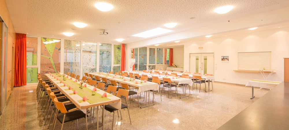 Neben der modernen und hochwertigen Ausstattung mit Multimedia-Technik, hochwertigem Mobiliar und kreativem Deko, überzeugt der Saal vor allem auch durch sein dynamisches und alpinsportliches Flair - der Blick auf die Kletterer an den über 200 Routen in der 12 m hohen Kletterhalle hat noch jede/n Besucher/-in in den Bann gezogen.