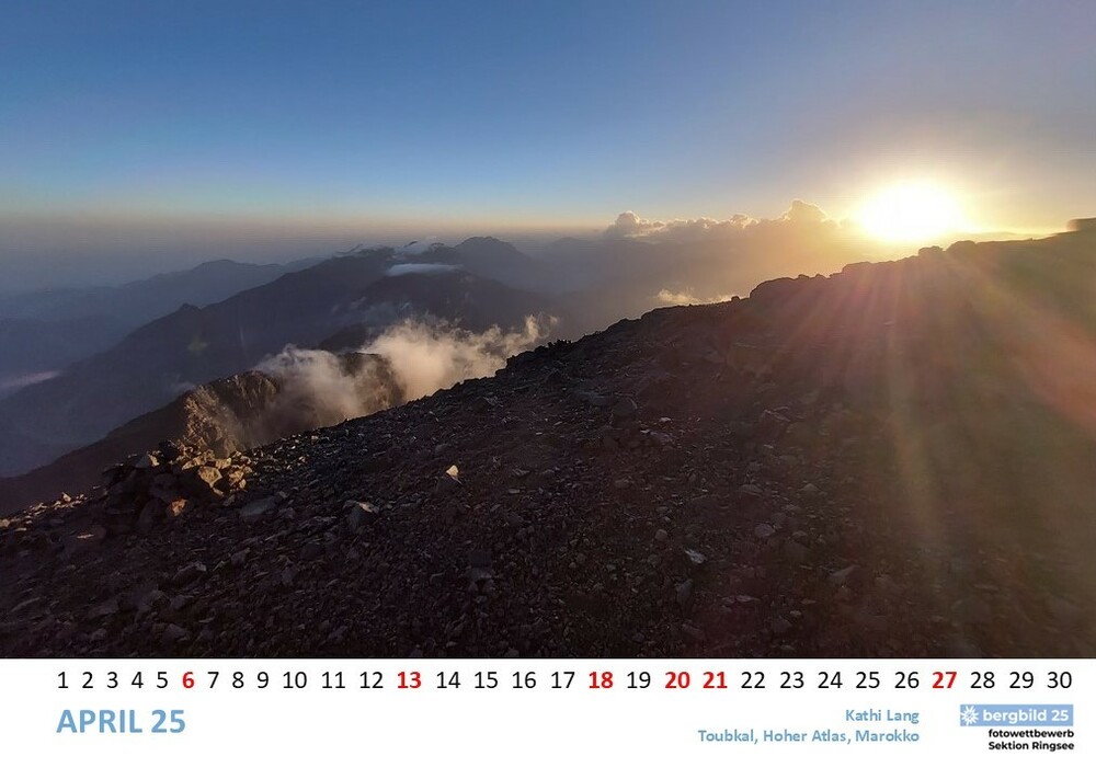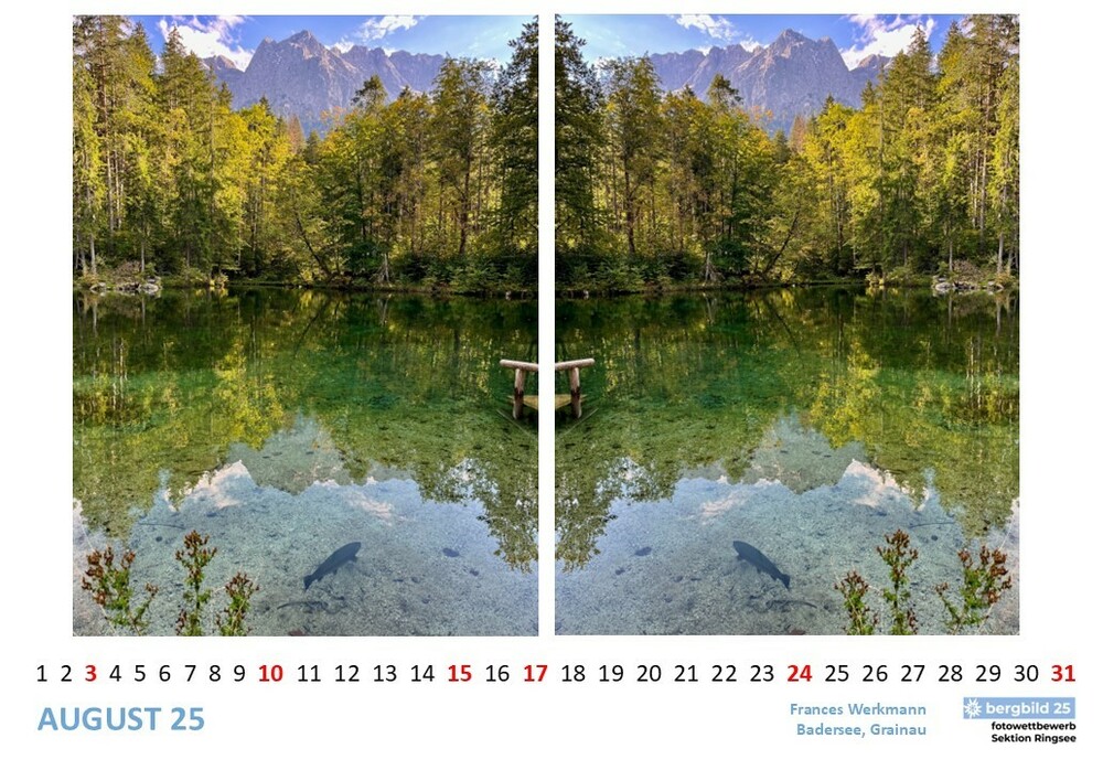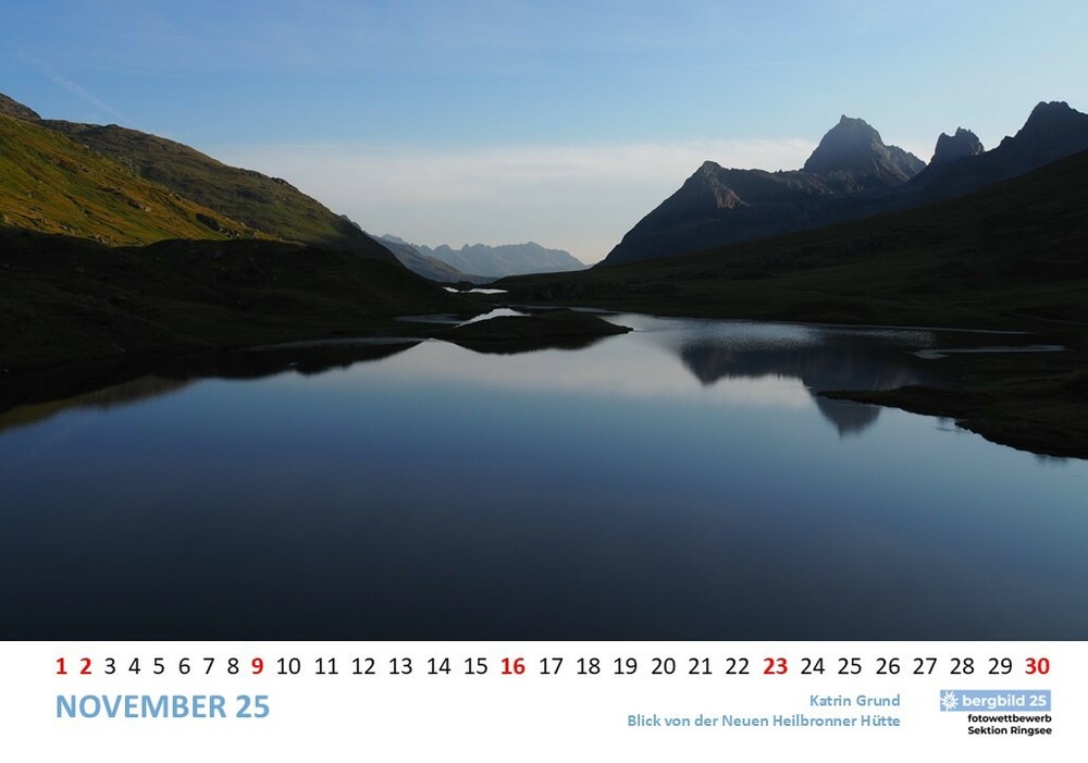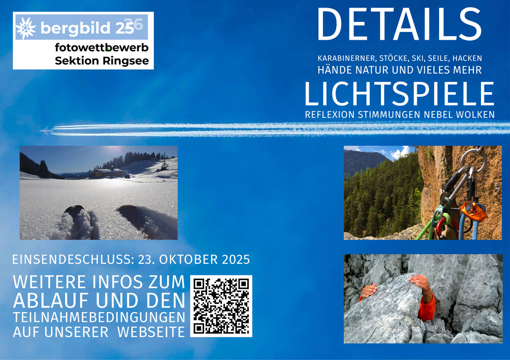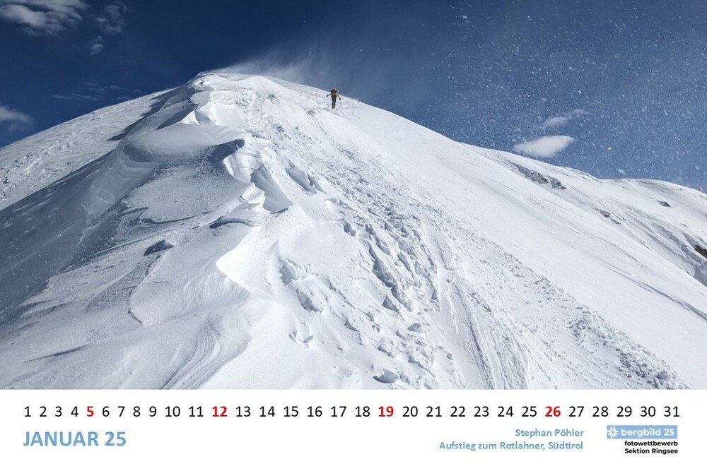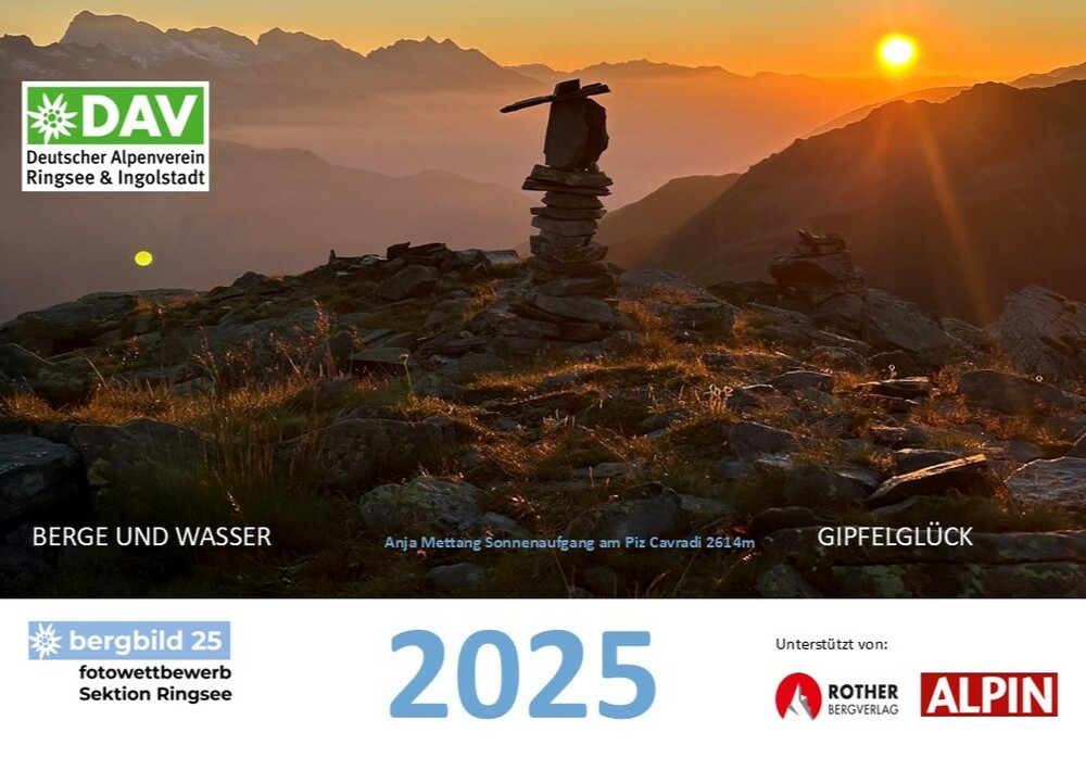 Die 13 besten Einsendungen des Wettbwerbs bergbild 24/25 schmücken den Vereinswandkalender des laufenden Jahres. Im Format A2 schmücken sie die Wände der Geschäftsstelle Ringsee und des Flurs zu den Umkleideräumen der Kletterhalle, Die Prämierung der Siegerbilder findet im Herbst im Rahmen eines "bergbild Fotoabends". statt. Der Termin steht noch nicht fest.