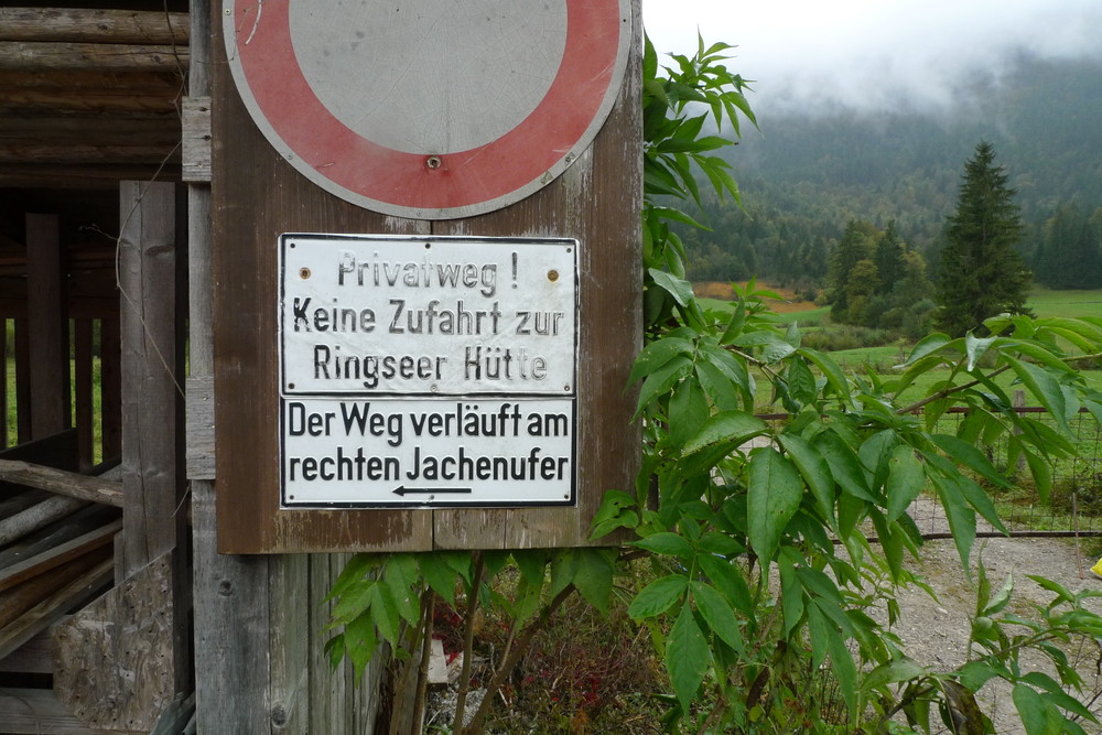 Dort seht Ihr das Schild:“Weg zur Ringseer-Hütte“ (siehe Skizze). Der Weg ist mit einem großen Stein versperrt, sodass er nicht befahren werden kann.
