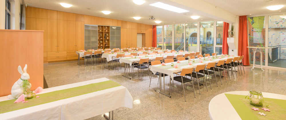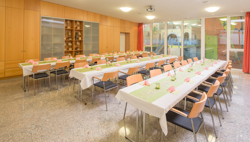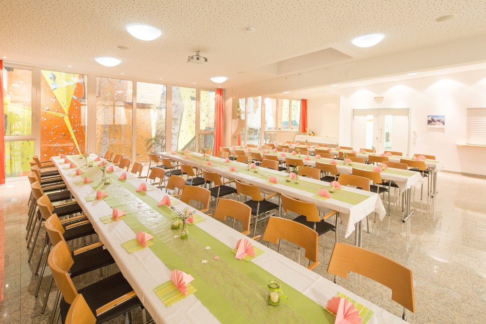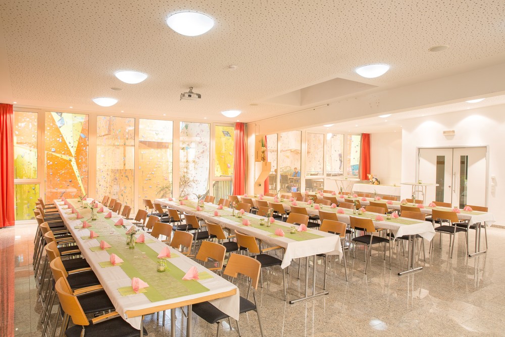 Neben der modernen und hochwertigen Ausstattung mit Multimedia-Technik, hochwertigem Mobiliar und kreativem Deko, überzeugt der Saal vor allem auch durch sein dynamisches und alpinsportliches Flair - der Blick auf die Kletterer an den über 200 Routen in der 12 m hohen Kletterhalle hat noch jede/n Besucher/-in in den Bann gezogen.