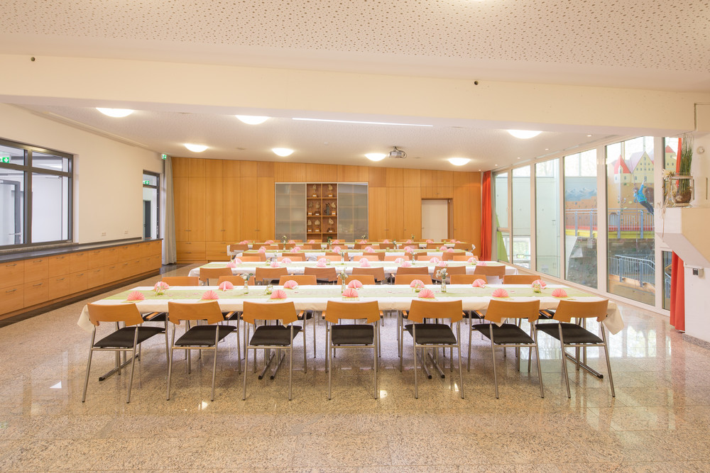 Dem Saal angegliedert sind eine voll ausgestattet Küche mit Ausschank, Garderobe und modernen Sanitäranlagen. Das Personal für Ausschank und Service wird in der Regel von uns gestellt, das Catering ist selbst zu organisieren. Wegen der angespannten Personalsituation sind private Feiern zur Zeit nicht möglich.